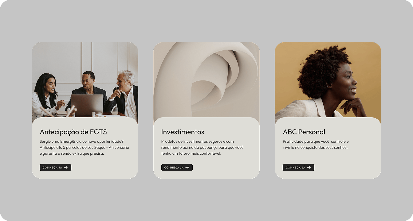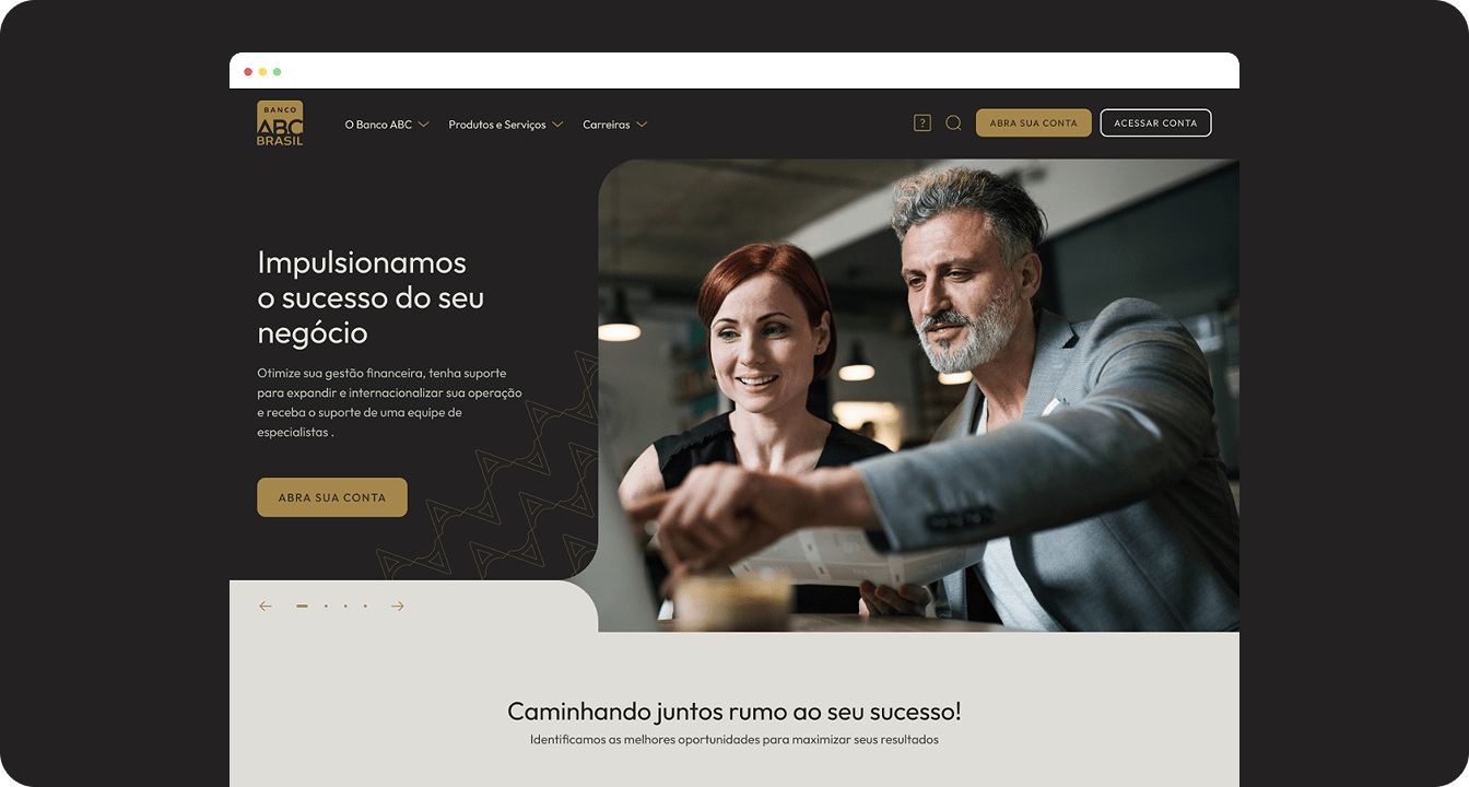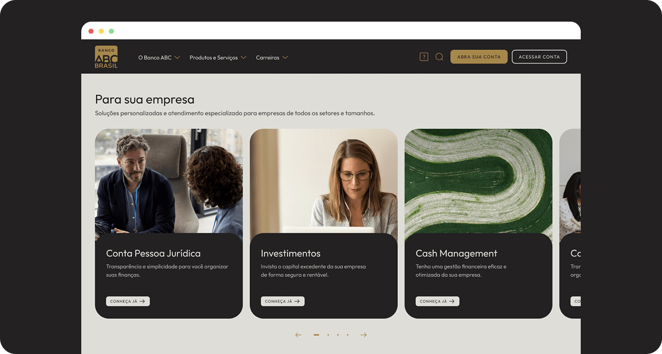 O Banco ABC tinha como objetivo reorganizar toda a estrutura do site, mapeando de forma clara os diversos produtos e serviços financeiros oferecidos. Para isso, conduzimos um processo completo de Discovery, com pesquisa de mercado, análises de benchmarks e entrevistas com stakeholders e clientes corporativos, garantindo decisões baseadas em dados reais e alinhadas às necessidades dos públicos.